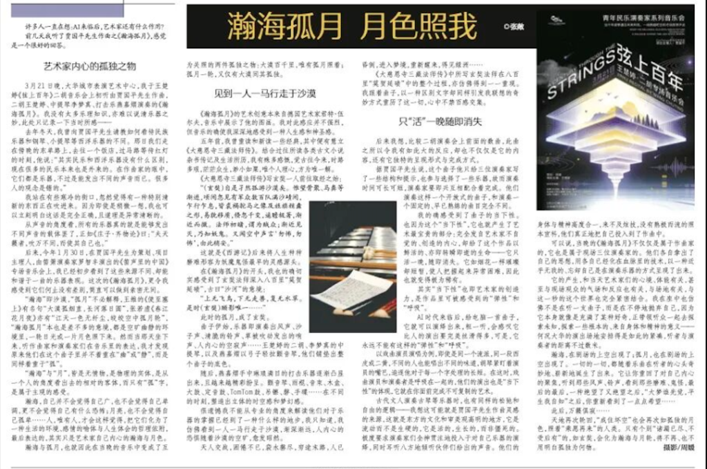 可以说,当晚的《瀚海孤月》不仅仅是属于作曲家的,它也是属于现场三位演奏家的。他们各自拿出了自己的思想,用各自已经化在血脉里的技术,以一种近乎无我的、忘却自己是在演奏乐器的方式呈现了出来。